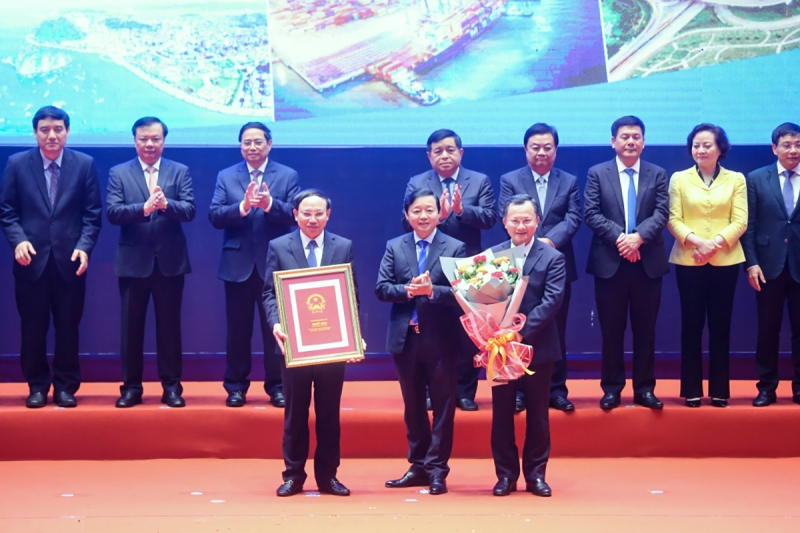 El viceprimer ministro Tran Hong Ha (centro, primera fila) entrega la decisión de Planificación Provincial de Quang Ninh para el período 2021-2030, con visión para 2045 a los dirigentes locales. (Foto: VOV) |