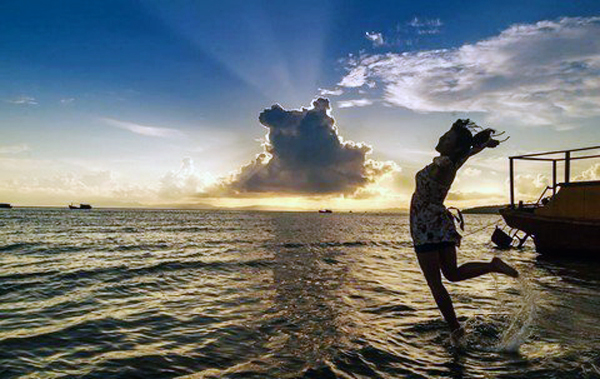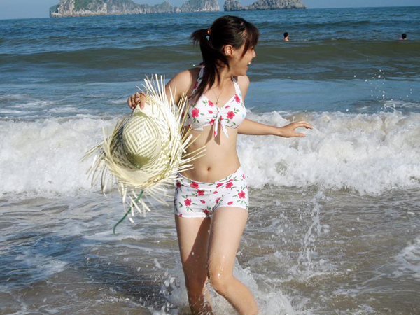 ![]() Una turista juega con olas del mar Cat Ba