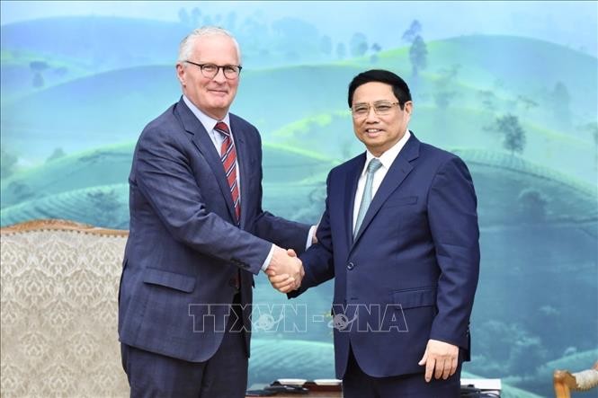 El primer ministro Pham Minh Chinh da una cálida bienvenida al presidente y director general de NVIDIA, Jensen Huang. (Foto: VGP) |