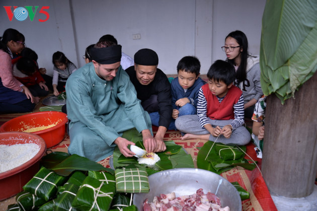 Vestido con el traje tradicional de Ao Dai, el estadounidense Erik tiene una experiencia interesante al elaborar su propio Banh Chung. |