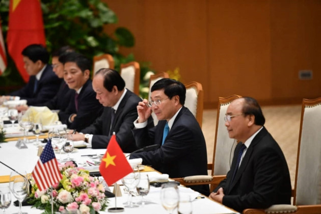 En la sede del Gobierno vietnamita, el primer ministro Nguyen Xuan Phuc recibe al presidente Donald Trump. |
