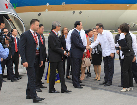 ![]() En el aeropuerto, el mandatario vietnamita expresó a la prensa su agradecimiento profundo a su homólogo cubano, Raúl Castro y otros dirigentes del Partido Comunista, Estado y el pueblo cubano por su recibimiento solemne y cordial |