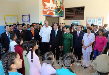 ![]() En la tarde del 16 de noviembre, el presidente Tran Dai Quang, junto con su esposa y la delegación de alto nivel de Vietnam visitaron la escuela primaria Nguyen Van Troi, en La Habana |