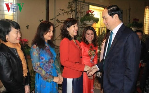 Poco después de arribar a la capital de Roma, Tran Dai Quang visitó la comunidad de la embajada vietnamita y se reunió con representantes de la diáspora nacional en Italia. En el encuentro, el estadista reafirmó la postura de Hanoi de dinamizar los lazos de cooperación foránea y elevar el prestigio del país en la palestra internacional. Consideró que los nexos políticos entre los dos Estados fueron consolidados y desarrollados, mientras que la colaboración bilateral en materia de economía, comercio, ciencia-tecnología, cultura y educación-formación registró un fuerte desarrollo. Destacó también la postura de Hanoi de apreciar los aportes valiosos de los conterráneos residentes en ultramar, considerándolos como una parte inseparable de la nación. Al respecto, el mandatario vietnamita señaló: “En lo adelante, sugiero que las agencias de representación de Vietnam en Italia, continúe enalteciendo su responsabilidad y coordinando estrechamente con las autoridades locales para contribuir positivamente al fomento de las relaciones bilaterales. Espero que cada conciudadano aquí será un puente para presentar a los amigos internacionales la imagen del país, la gente y cultura de Vietnam, en contribución a la comprensión mutua entre los dos pueblos. Deseo que nuestros compatriotas sigan promoviendo la tradición de solidaridad y ayuda mutua, e igualmente respeten las leyes locales, mantengan y promuevan la identidad cultural nacional, así como contribuyan más activamente al desarrollo del país de origen”.