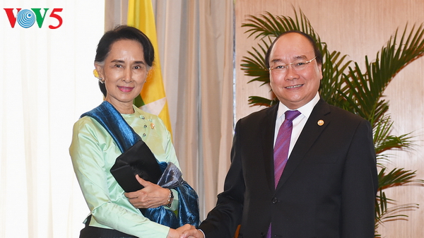 En esta ocasión, Nguyen Xuan Phuc se reunió con Aung San Suu Kyi, jefa de la delegación birmana participante en la trigésima Reunión de Altos Funcionarios de la Asean. Los dos líderes acordaron continuar debatiendo la firma temprana de los tratados de cooperación en el comercio, la inversión, el transporte, finanzas, justicia, educación, telecomunicaciones y especialmente la agricultura y defensa.