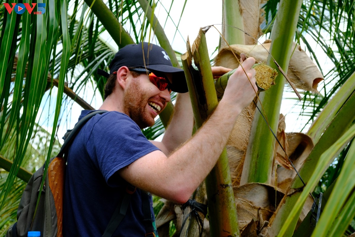 Visitantes participan en la experiencia de extraer néctar de coco de forma artesanal. (Foto: Thach Tra Vinh/VOV) |