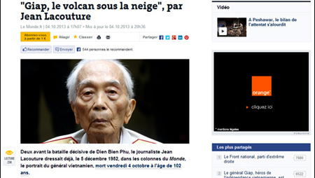 Un acto especial en conmemoración de la partida del estratega militar y el aniversario 40 de la firma del Acuerdo de Paz de París fue celebrado el lunes en la capital francesa. El presidente nacional del Partido Comunista de Francia, Pierre Laurent destacó que el general Giap dirigió el Ejército vietnamita para hacer la historia, poniendo fin a las guerras y devolviendo la paz a la nación asiática. “El general Giap se sentiría alegre, pues los valores a los que dedicaba su lucha de toda la vida continuarán manteniéndose y extendiéndose después de que partiera. El Partido Comunista de Francia y los franceses amantes de la paz comparten hoy con el pueblo vietnamita esta gran pérdida. El periódico “L´Humanité” difunde en la edición de hoy un especial en honor del general Vo Nguyen Giap.”