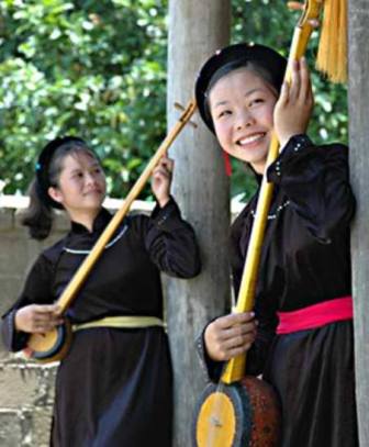 ![]() Un viejo artesano enseña a jóvencitas locales a tocar el "tinh tau" y cantar las coplas "then"