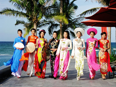 Muchachas de la etnia mayoritaria Kinh en túnica tradicional