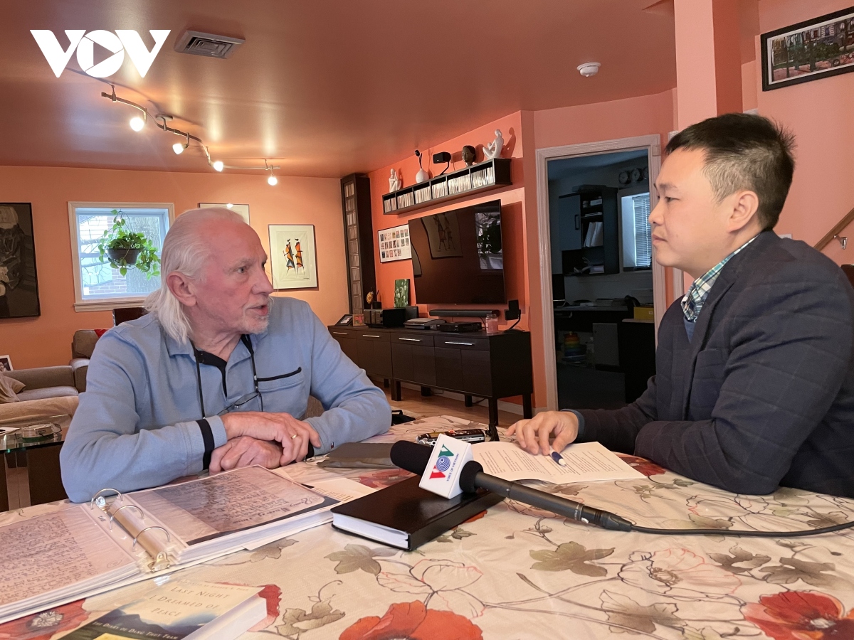 El periodista Pham Huan (d), corresponsal de la VOV en Estados Unidos, el primer periodista vietnamita que conoció y entrevistó directamente al veterano estadounidense Peter Mathews. |