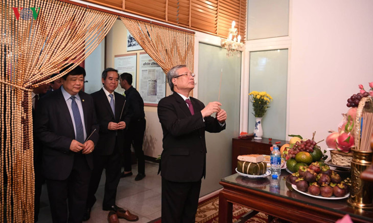 El miembro permanente del Secretariado del Comité Central del PCV, Tran Quoc Vuong, y otros funcionarios ofrendan inciensos en el alta del presidente Ho Chi Minh en la sede de la Voz de Vietnam. |
