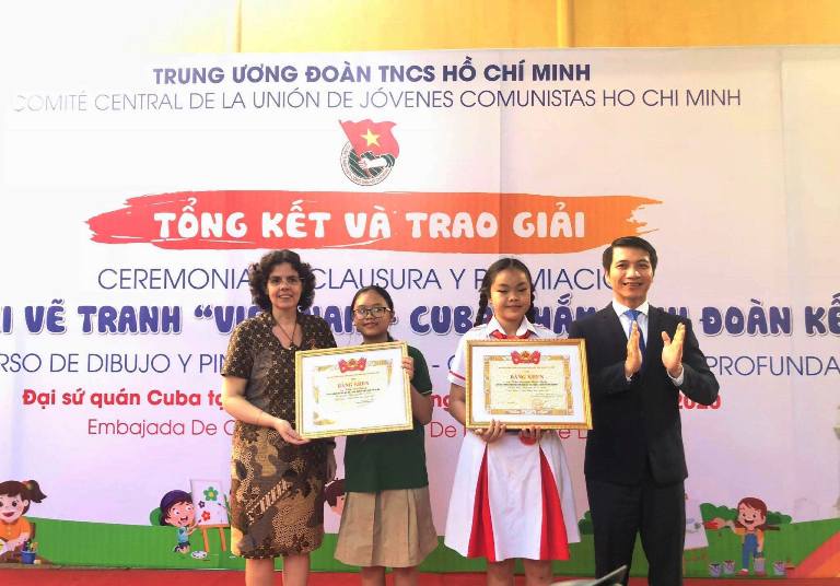 El vicetitular de la Academia Nacional de Política Ho Chi Minh Duong Trung Y regala una pintura de recuerdo a la embajadora cubana en Hanói, Lianys Torres Rivera. (Foto: thoidai.com.vn) |
