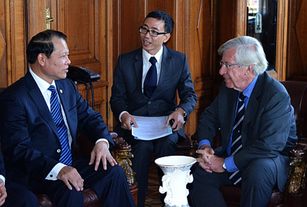 El embajador de Uruguay en Hanoi, Carlos Irigaray (i.) y el viceministro de