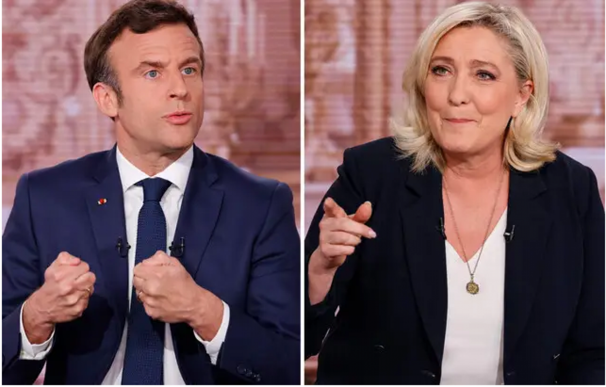 Dos candidatos a la presidencia Emmanuel Macron (izquierda) y Marine Le Pen durante un debate televisado en vivo el 20 de abril de 2022. (Foto: AFP/VNA) |