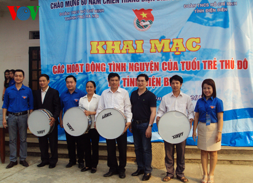 (VOVworld) - En respuesta al Año de jóvenes voluntarios 20l4 y dirigiéndose al aniversario 60 de la victoria de Dien Bien Phu, 7 de mayo, la Unión de la Juventud Comunista Ho Chi Minh de Hanoi coordinó con similar organización de la provincia de Dien Bien y otras instituciones para iniciar las actividades de los jóvenes voluntarios capitalinos en esa localidad. En esta ocasión 40 jóvenes hanoyenses consultarán y distribuirán medicinas a mil personas de situación difícil, construirán una casa de seminternado de l00 millones de dong y un campo de juego para niños de 50 millones de dong. Además, entregarán libretas, libros de texto e instrumentos docentes a las escuelas primaria y secundaria locales.