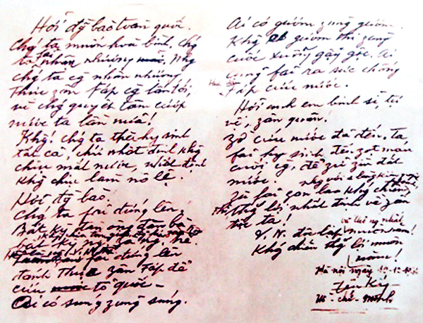 El texto original del llamamiento a la resistencia nacional del presidente Ho Chi Minh