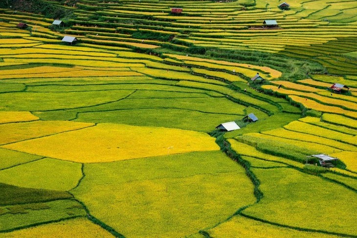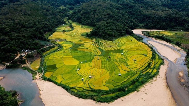 A partir de finales de mayo, las terrazas de arroz de la aldea de Kon Tu Rang (distrito de Kon Plong, provincia de Kon Tum) cambian de color, exhibiendo una imagen dorada brillante. Foto: Hi Mang Den. |