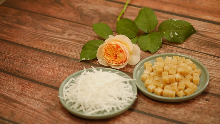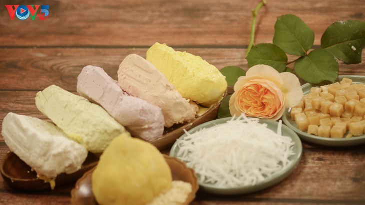 Ingredientes para el “banh chay”: harina de arroz pegajoso, frijol mungo, azúcar, tapioca, sésamo y petalos de la flor de pomelo o esencia de flor de plátano. |