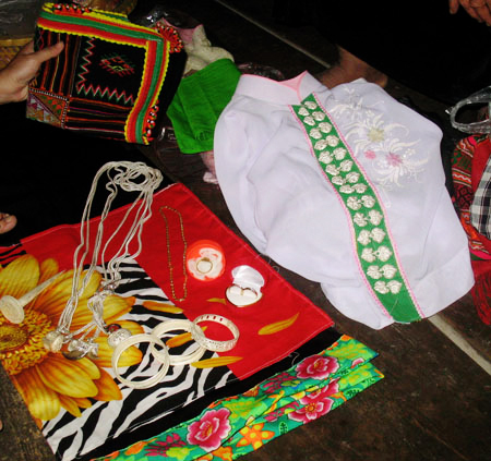 Las hileras de botones de plata en forma de mariposa “mák pém” tienen también un significado sutil sobre la vida humana. Las mariposas en la primera línea son masculinas y en la segunda, femeninas. Las mozas llevan el número impar de botones y las casadas, el par. Tong Thi Vuong, de la aldea Dan dijo: “Además del valor decorativo, estas dos filas de botones tienen un signo espiritual. Antes de mudarse a vivir con la familia de su esposo, los padres de las mozas les hacen una camisa “cóm” con un juego de botones de oro o plata y falda para que cuando mueran, descansen en paz vistiendo el atuendo tradicional”.