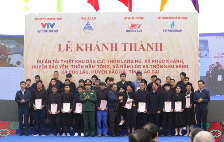 El primer ministro Pham Minh Chinh, el ministro de Defensa Phan Van Giang y dirigentes locales entregan títulos de propiedad a los habitantes de Lang Nu con nuevas casas. (Foto: VOV) |