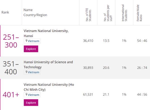 Mientras, cinco especialidades de la Universidad de Ciencia y Tecnología de Hanói, incluidas la ingeniería eléctrica y electrónica, la ingeniería mecánica, la aeronáutica y de manufactura, la informática y sistemas de información, la matemática y la ciencia de los materiales, fueron calificadas de modo positivo, elevando así sus posiciones en el ranking.