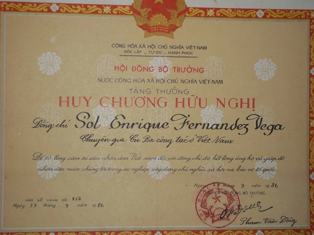 El ingeniero cubano también conserva este diploma firmado por Pham Van Dong , entonces Primer Ministro de la República Socialista de Vietnam