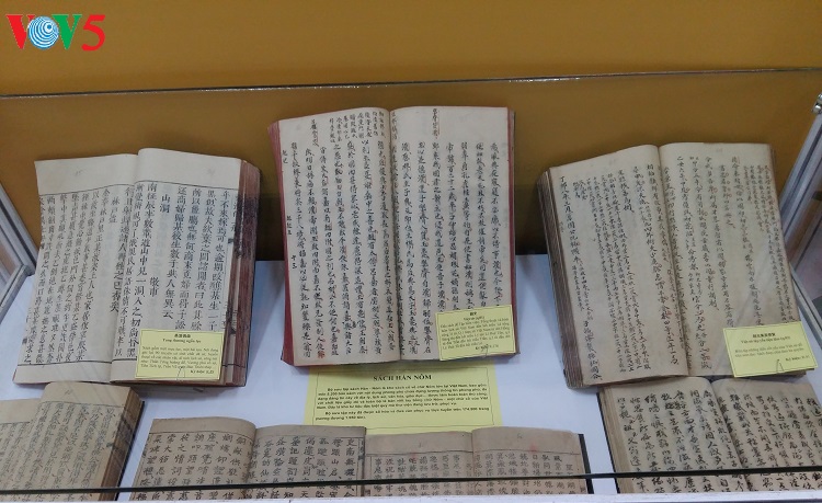Objetos expuestos en la muestra denominada "Un siglo en acompañamiento al país" en la Biblioteca Nacional de Vietnam |