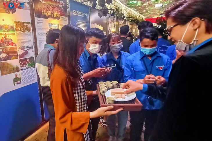 | Visitantes degustan provisiones secas y té verde, alimentos populares entre los soldados vietnamitas en su camino al frente. |