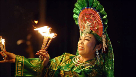 ![]() Trajes y accesorios al servicio del rito “Hau dong” simbolizan un lindo rasgo de esa creencia