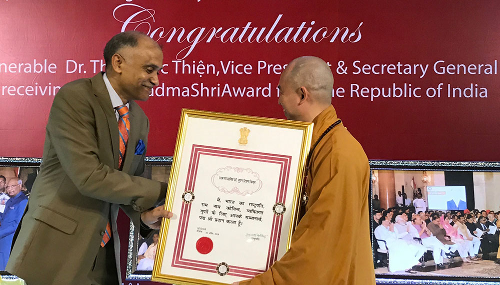 El embajador indio en Hanói, Parvathaneni Harish entrega el certificado dereconocimiento a las contribuciones del bonzo superior Thich Thien Duc en el desarrollo del budismo nacional y la cooperación religiosa entre los dos países (Foto: thoibao.today) |