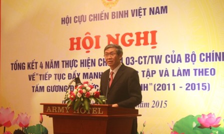(VOVworld) – La Asociación de Veteranos de guerra vietnamitas efectuó este martes en Hanoi una conferencia para evaluar los 4 años del cumplimiento de la Directiva número 03 del Buró Político sobre el “fortalecimiento del aprendizaje y el seguimiento del ejemplo moral de Ho Chi Minh”.