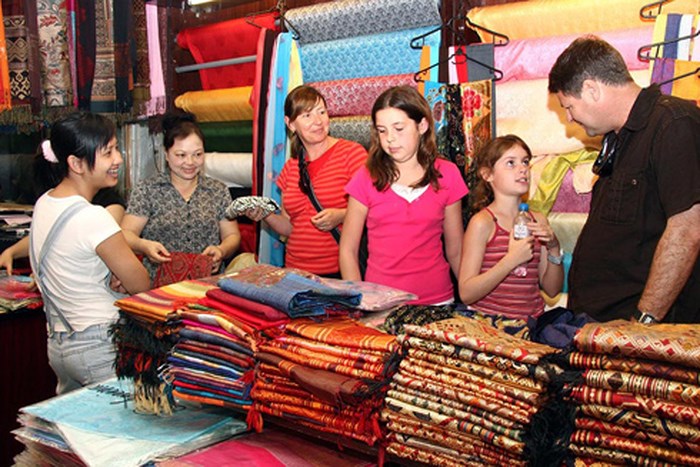 Turistas extranjeros visitan y compran productos de la aldea de seda de Van Phuc (Foto: anninhthudo.vn) |