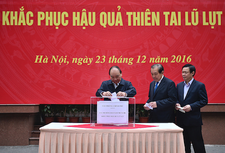 (VOVworld) - El primer ministro de Vietnam, Nguyen Xuan Phuc y los vicejefes del gobierno Truong Hoa Binh, Vuong Dinh Hue, Vu Duc Dam y Trinh Dinh Dung participaron en una recaudación de ayuda a los pobladores del sur de la región central afectados por inundaciones.