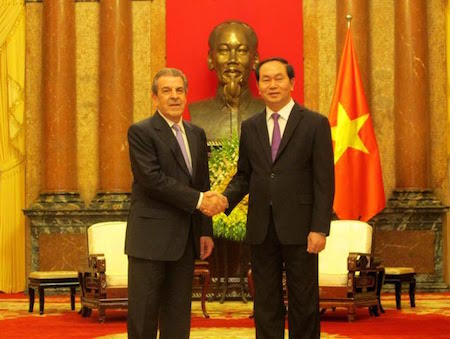 (VOVworld) – Chile es el primer país en el hemisferio occidental que firmó el tratado de libre comercio bilateral con Vietnam y se incluye en los primeros estados que reconocen la economía de mercado de esa nación indochina, recalcó el presidente vietnamita, Tran Dai Quang, al recibir este 14 de julio al ex presidente chileno y embajador en Misión Especial para el Asia Pacífico, Eduardo Frei Ruiz-Tagle.