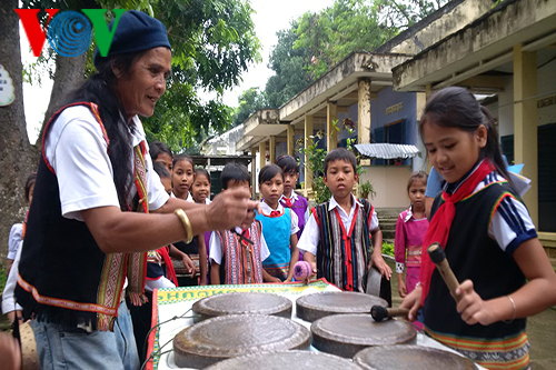 Les 700 élèves de l’école primaire Dang Tran Con, dans la commune de Ngoc Bay, sont majoritairement issus de l’ethnie minoritaire Ba Na. Tous les jours, après les cours et pendant le week end, ils s’exercent à jouer des gongs dans la cour de l’école et à danser les danses traditionnelles « xoang ». La richesse sonore du gong est illimitée, sa pratique nécessite beaucoup de concentration explique Dau Thi Lan, la directrice de l’école :