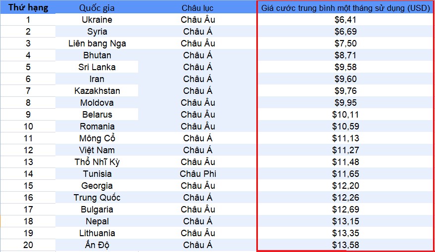 Dans ce classement qui répertorie les tarifs du haut débit proposés par 3.288 opérateurs de 211 pays et territoires, le Vietnam se positionne au douzième rang mondial avec un abonnement moyen autour des 11,27 dollars par mois. C’est aussi le pays dont les prix sont les plus stables, avec une augmentation de seulement 0,04 dollars en 2020 par rapport à 2019.