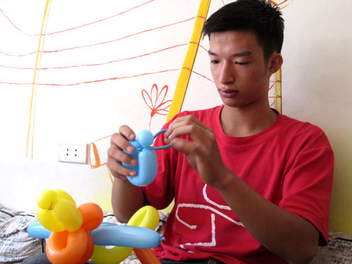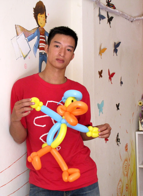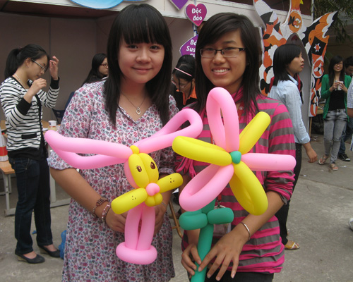 Hong Son est entrain de modeler un ballon jaune. Au bout de 4 minutes, on voit apparaître un chat auquel rien ne manque, pas même les griffes ou les oreilles. Seuls les yeux et les moustaches sont dessinés au feutre. La panthère rose, un chat hello kitty, un bonhomme de neige... on peut tout faire en airigami ! « Airigami », donc ! Ce terme, japonisant sans doute par référence à l’origami, pourrait se traduire en français par « modeler un ballon ». Et les personnes qui pratiquent cet art s’appellent donc des « twisters » comme nous vous le disions en introduction. Qui sait ? Les membres de l’académie française parviendront peut-être à trouver un nom bien gaulois pour désigner cet art et ses praticiens, mais en attendant, il faudra bien se contenter de ce sabir anglo-nippon ! En tout cas, Hong Son, pour en revenir à lui, est membre du club d’Airigami de Hanoi.