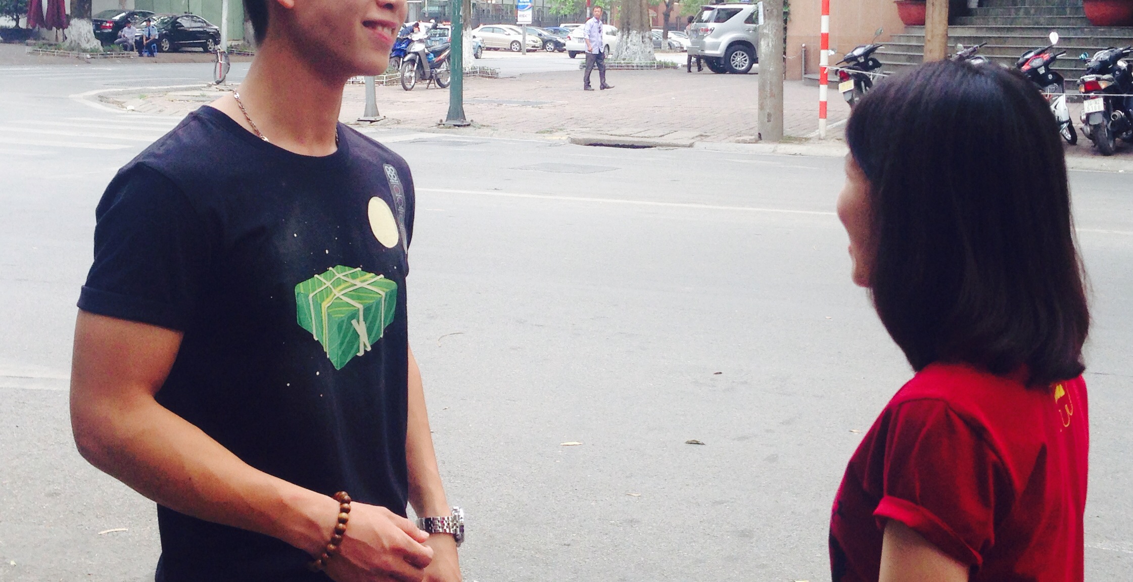 Je ne fais pas non plus exception à cette tendance et pour rencontrer le fondateur de la marque, un certain Đỗ Việt Anh, je décide de porter un tee-shirt « Boo » sur lequel est imprimé un dessin de la Terre, mais d’une coiffée d’un casque contre les ultraviolets.
