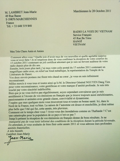 Bienvenus à ce rendez-vous hebdomadaire ! Nous avons reçu dans la semaine des remerciements chaleureux de M. Christian Ghibaudo, de France. Il nous confie : « Je voudrais vous remercier pour l’envoi du souvenir marquant mes 10 années d’écoute de la Voix du Vietnam. Cela a été une très grande surprise et j’ai été très heureux de recevoir ce cadeau. Que d’avancées en 10 ans, alors qu’au début c’était seulement l’écoute par les ondes courtes, maintenant c’est possible de vous écouter via Internet en direct et surtout, ce qui est important, c’est le podcast des émissions. C’est une très bonne chose, de pouvoir écouter toutes les émissions des jours précédents. » Cher ami, votre fierté est toujours une grande source d’encouragement pour notre rédaction.