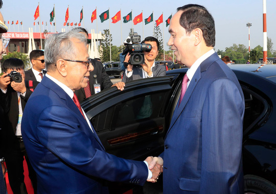 bangladais Mohammad Abdul Hamid reçoit son homologue vietnamien Tran Dai Quang (à gauche) à l'aéroport. |