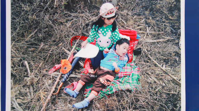Nguyet, une élève de CM1, nous parle de sa photo : « J’ai cinq photos au total mais celle que je préfère, c’est celle où on voit ma petite soeur en train de porter mon petit-frère au milieu des brûlis. Il est handicapé, mon petit-frère, mais je l’aime beaucoup ! »