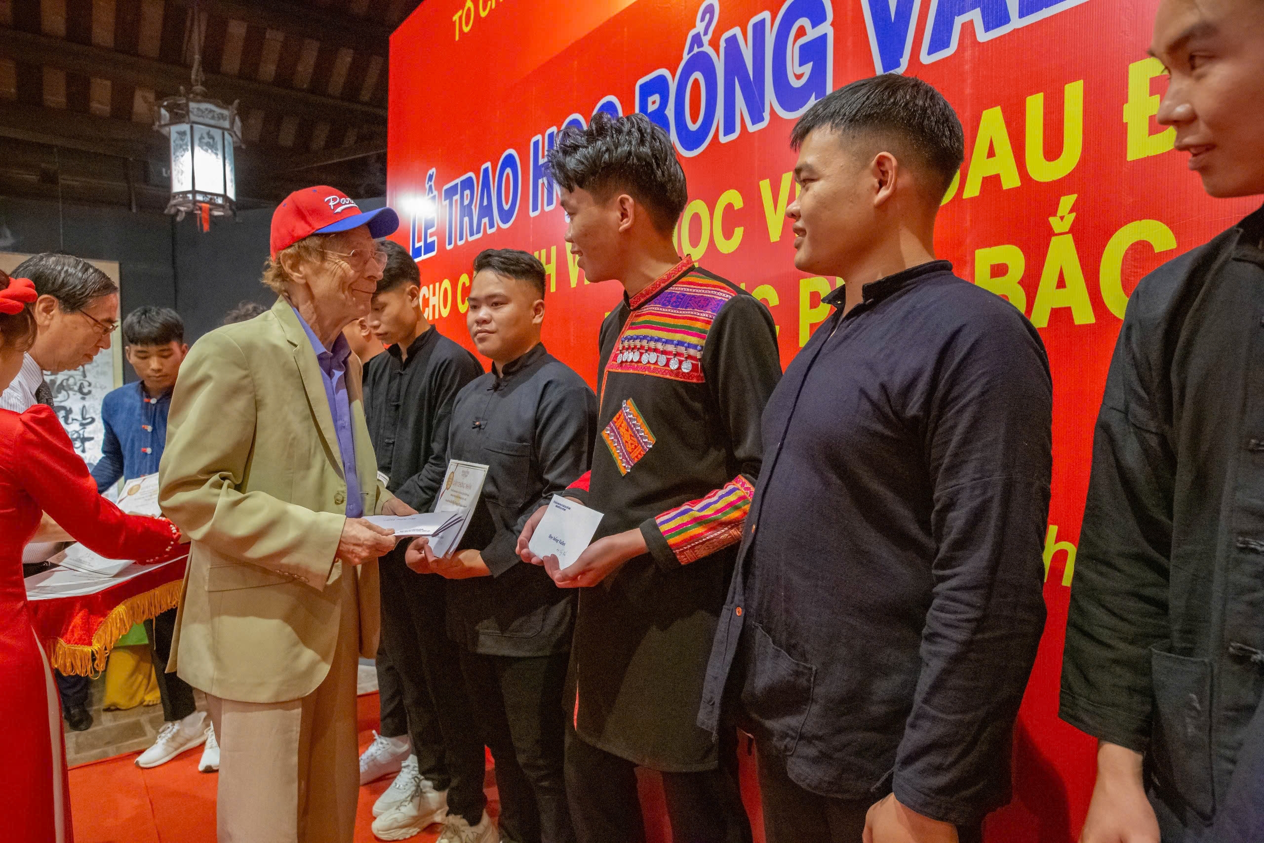 Le professeur Odon Vallet (casquette rouge) remet des bourses à des étudiants issus de minorités ethniques de l'Université du Viêt Bac, en septembre 2023. Photo: ICISE |