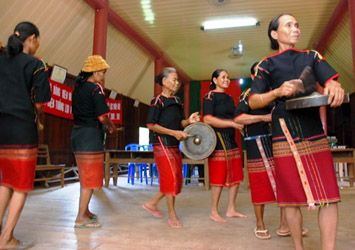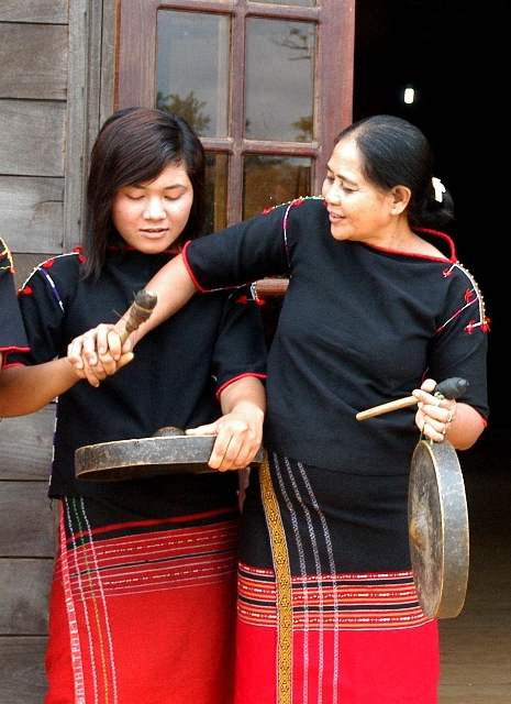 Aduon Nho, qui est déjà septuagénaire, a consacré les deux tiers de son existence à la troupe de gongs de son hameau. Pour elle, faire sonner les gongs est une chose aussi naturelle que respirer, manger ou boire. C’est sa mère qui l’a initiée, lorsqu’elle avait 10 ans. Inutile de préciser qu’elle connaît absolument par cœur tout le répertoire, si tant est qu’il y ait un répertoire puisqu’il s’agit de musiques de tradition orale.