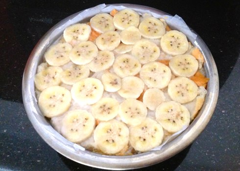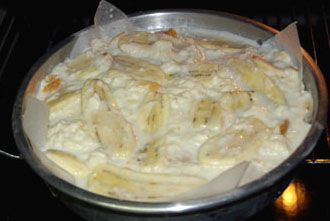 Tapissez le moule à gateau de papier de cuisson. Alternez une couche de bananes avec une couche d’environ 1 cm d’épaisseur de pâte de pain, puis une couche de bananes et une couche de pâte de pain, et terminez par une couche de bananes.