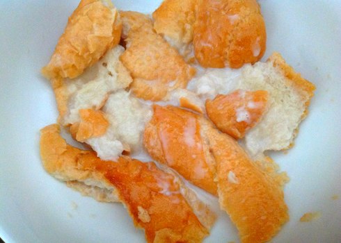 Rompez le pain à la main en petits morceaux. Versez du lait pour ramollir. Laissez reposer 10 minutes. A l’aide d’une fourchette, écrasez le pain trempé.