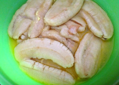 Voici la version remaniée du gâteau à la banane et au lait de coco vietnamien. Pour 6 personnes. Comme ingrédients, vous devez utiliser 500 grammes de bananes ; 200 grammes de pain rassis ou une baguette ou pain de mie à émietter ; un œuf, 200 ml de lait de coco ; 50 ml de lait ; 25 g de beurre fondu ; 60 g de cassonade ; 1 cuillère à café d’extrait de vanille ; et du sel. On commence !