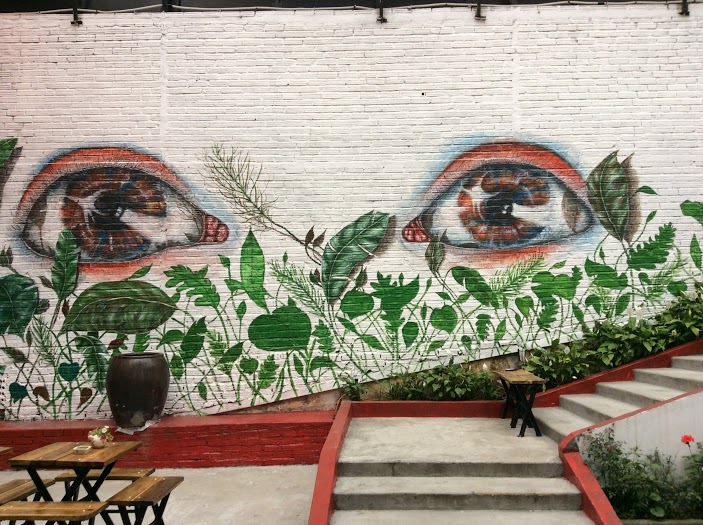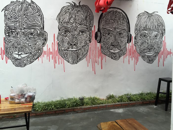 Dede Guardiola : Je suis en train de développer le concept de Hanoi Rock City, j’ai déjà peint plusieurs murs dans ce lieu. Ça change, Hanoi Rock City, quand je suis arrivée à Hanoi. C’était un lieu de fêtes, de soirées, d’événements,… le week-end où la majorité des gens arrivent après minuit. Là on essaye de développer un concept de jour, parce que c’est un espace superbe qui peut accueillir énormément de monde, mais qu’on n’utilisait pas dans la journée. Donc on a développé ce concept-là, on a ouvert un shop de second-hand, on a des workshops de temps à autre, j’anime des cours d’art plastique pour les enfants samedi matin… et on a ouvert un café avec le déjeuner tous les jours de la semaine. Moi, je m’occupe de tout ce qui est visuel pour ce concept de jour : peindre les murs, faire les affiches, les logos,… C’est un gros projet où je fais le lien entre chacune de ces petits groupes, et on crée une réelle communauté dans ce lieu-là.