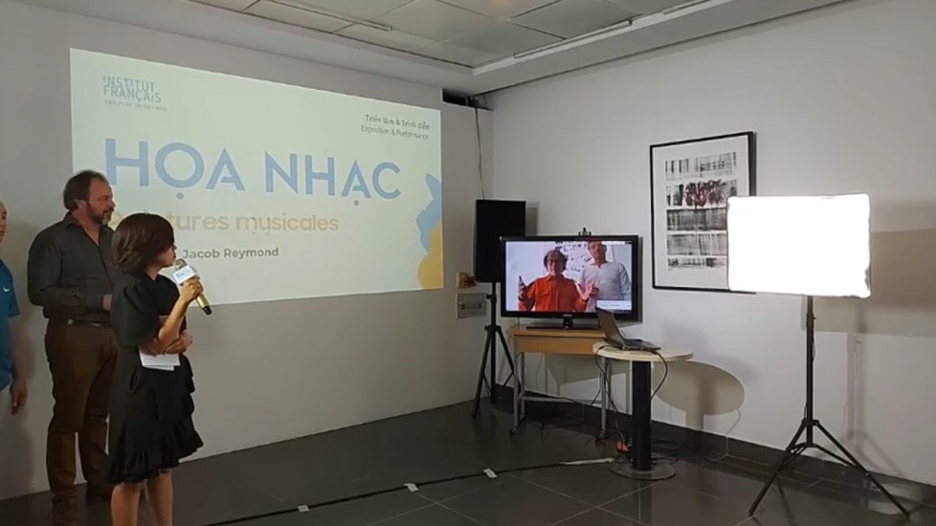 Discussion en live entre artiste et spectateurs lors du vernissage de l'exposition. Photo: Institut français de Hanoi (IFV) |
