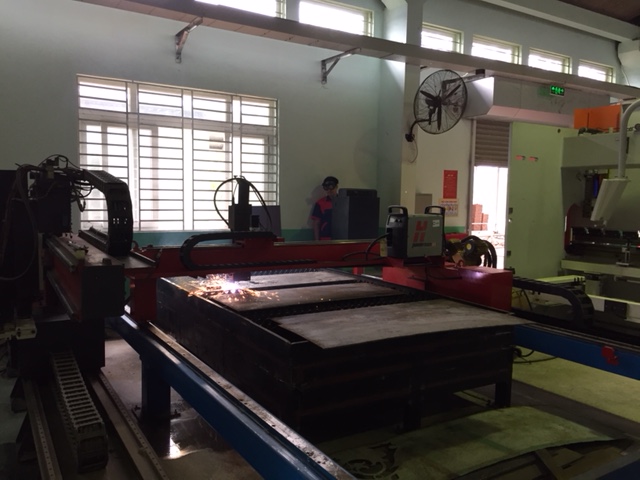 Dans l’atelier de chaudronnerie, le professeur Hô Si Khuong apprend à ses étudiants la technique de découpage d’une tôle. Le découpage du métal est l’une des 4 filières ayant bénéficié des assistances de l’AFD, les trois autres étant le soudage, l’électricité industrielle et de la maintenance automobile. Hô Si Khuong, qui est également le chef-adjoint du département de mécanique, apprécie énormément ces assistances, qui, depuis un an qu’elles sont dispensées, font considérablement avancer le travail.