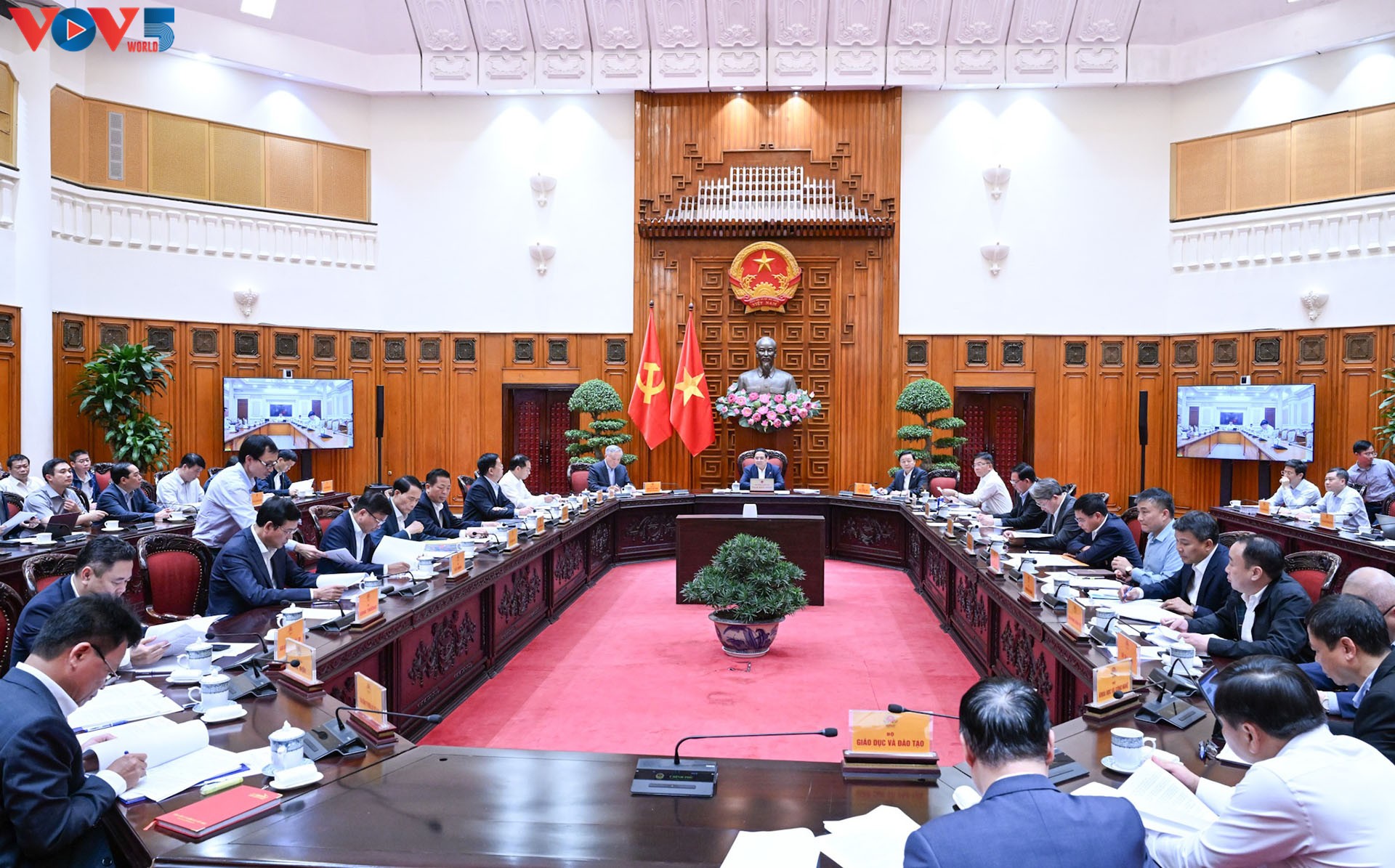 Le Premier ministre Pham Minh Chinh préside la réunion de la Permanence du gouvernement avec les ministères et les représentants de Hanoï et Hô Chi Minh-Ville pour discuter des principaux projets ferroviaires. Photo: Lại Hoa/ VOV |
